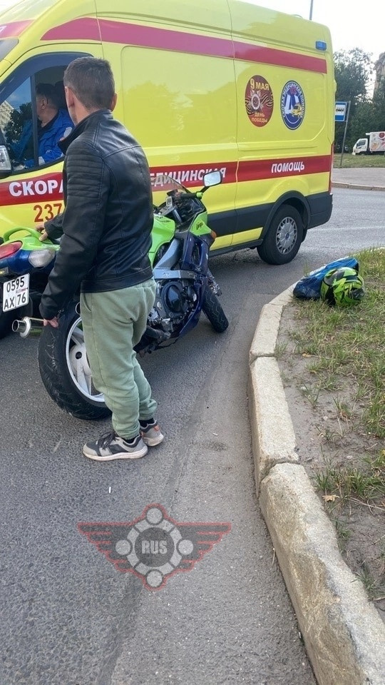Дтп с мото на перекрестке Октябрьской наб. и пр. Большевиков. Авто и мот Kawasaki ZZR 400 номер 0595АХ76. У мотоциклиста травма ноги. Службы на месте. Родственники на месте. Помощь не требуется.