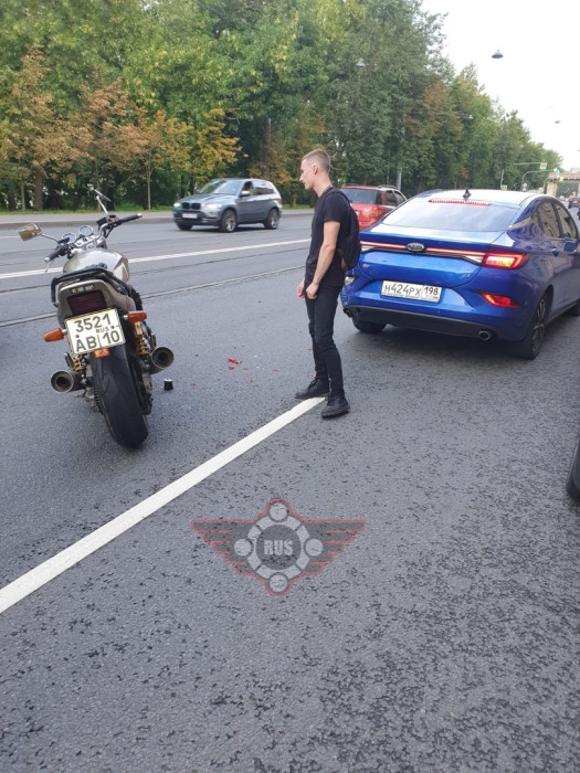 Дтп с мото на пр. Обуховской Обороны, д. 21. Авто и мот Yamaha XJR1200 номер 3521АВ10. Мотоциклист не пострадал, ушиб колено.