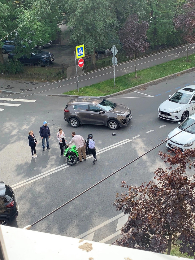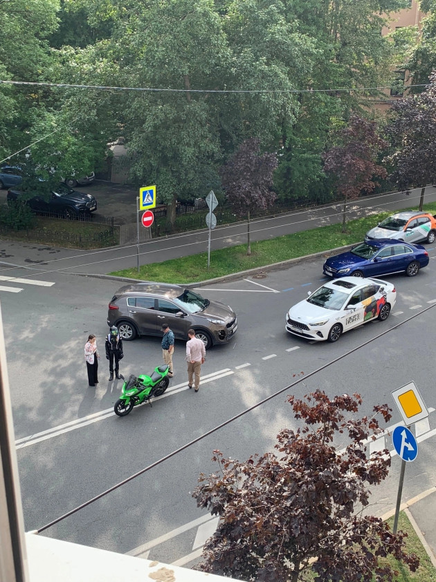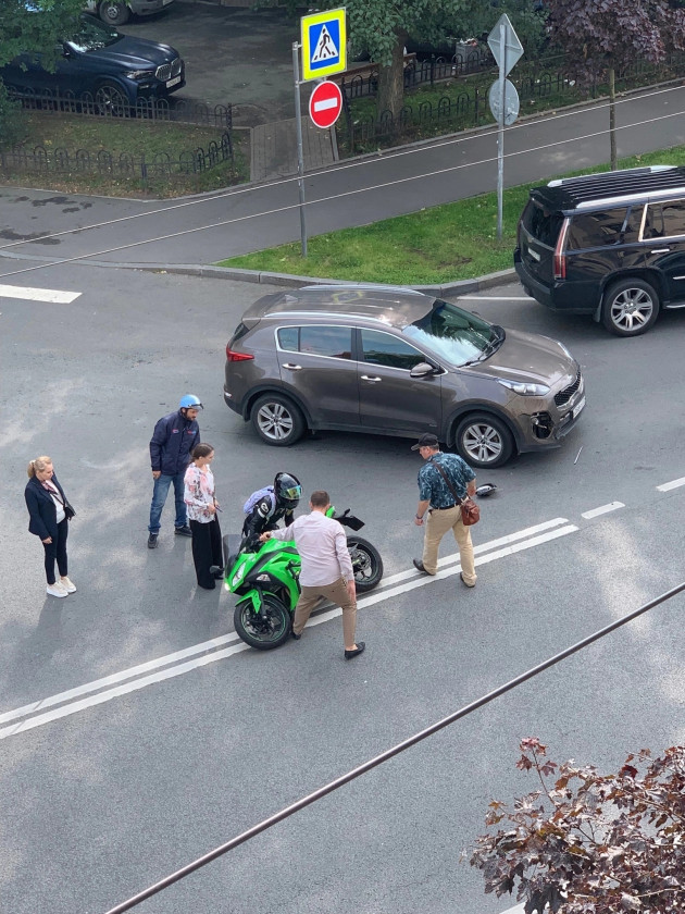 Дтп с мото на перекрестке Левашовского пр. и Плуталовой ул.. Авто и мот. Мотоциклист на ногах.