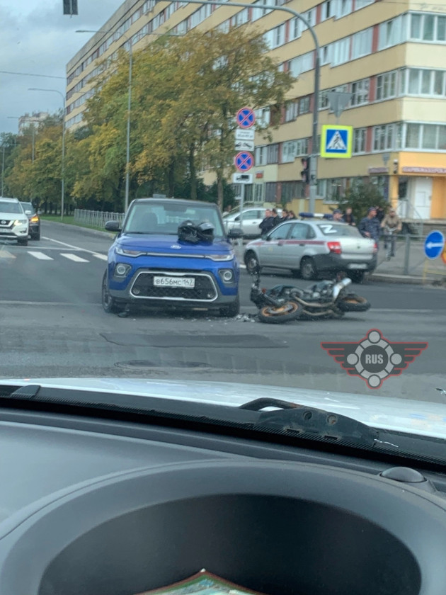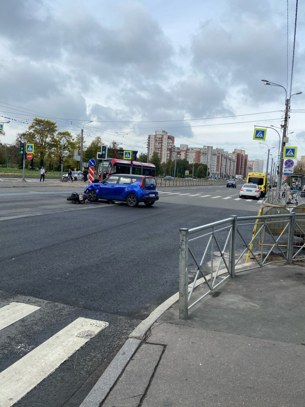 Дтп с мото на перекрестке ул. Ольги Форш и пр Просвещения. Авто и мот 2034АС78. Службы на месте. О состоянии мотоциклиста и пассажира информации нет.