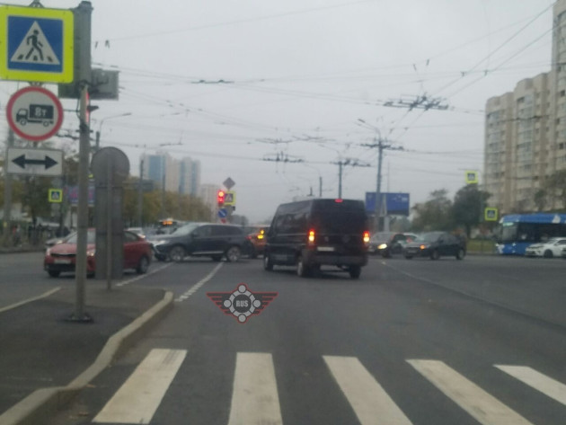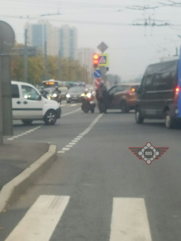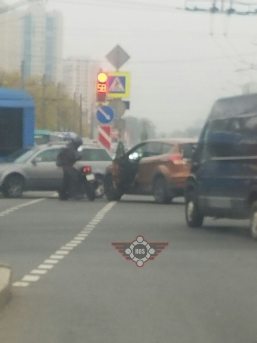 Дтп с мото на перекрестке пр. Маршала Жукова Ленинского пр. Авто Ford Kuga и мот. Мотоциклист на ногах. Помощь не требуется.