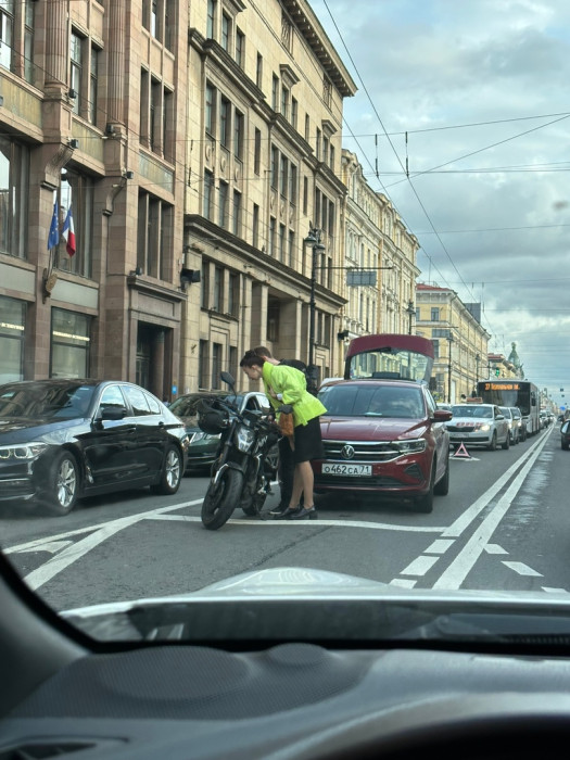 Дтп с мото на Невском пр., д.14. Авто и мот. Мотоциклист на ногах.