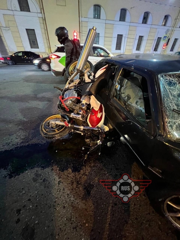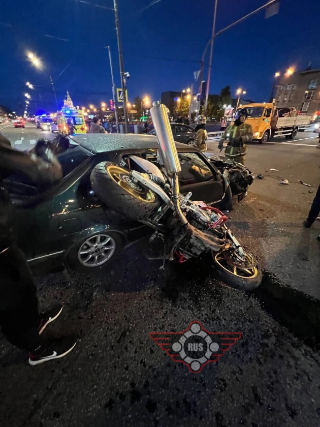 Дтп с мото на перекрестке наб. Обводного канала и Митрофаньевского ш.. Авто и мот Honda CB номер 2354АР78. Мотоциклист лежит. Предположительно, ещё пострадал пассажир (девушка). Скорая, 2 реанимации и пожарные уже на месте.