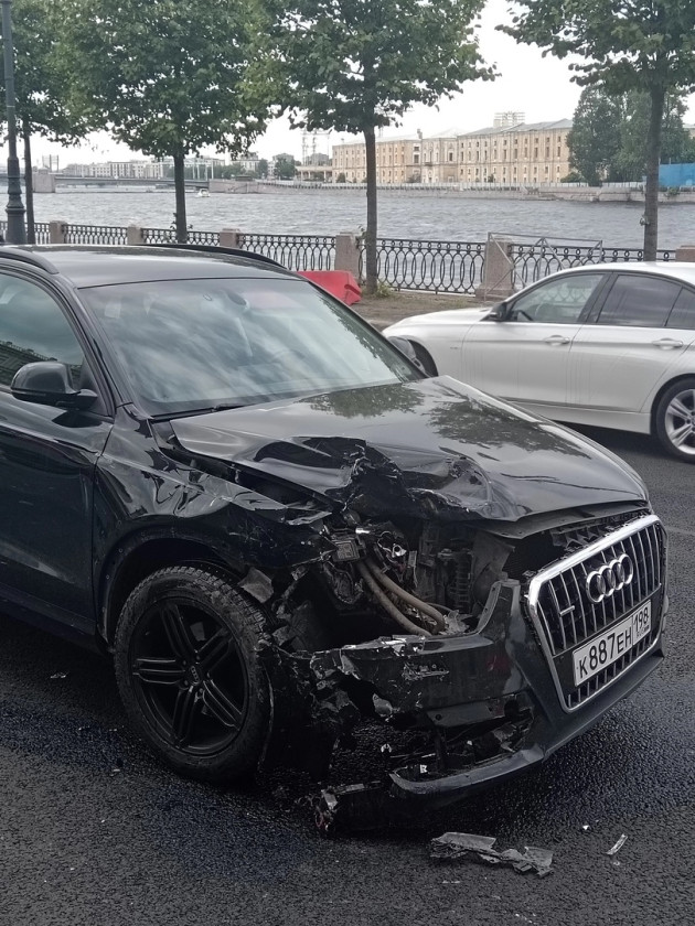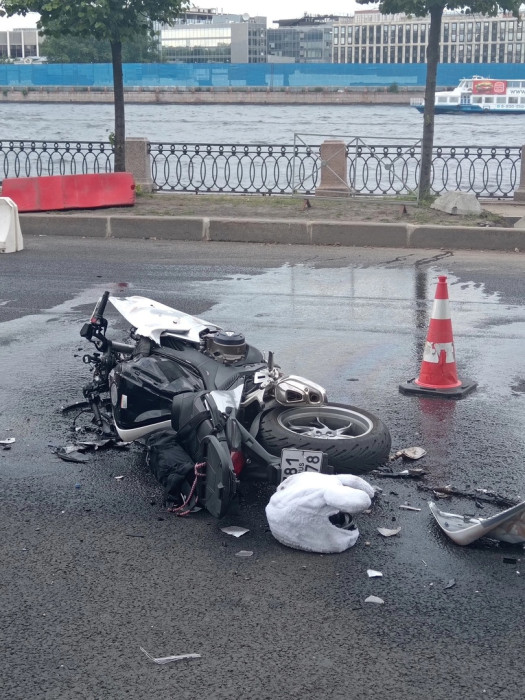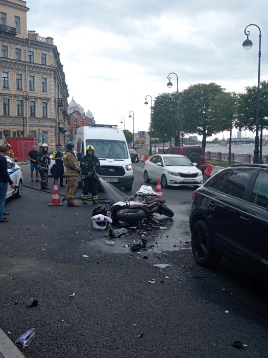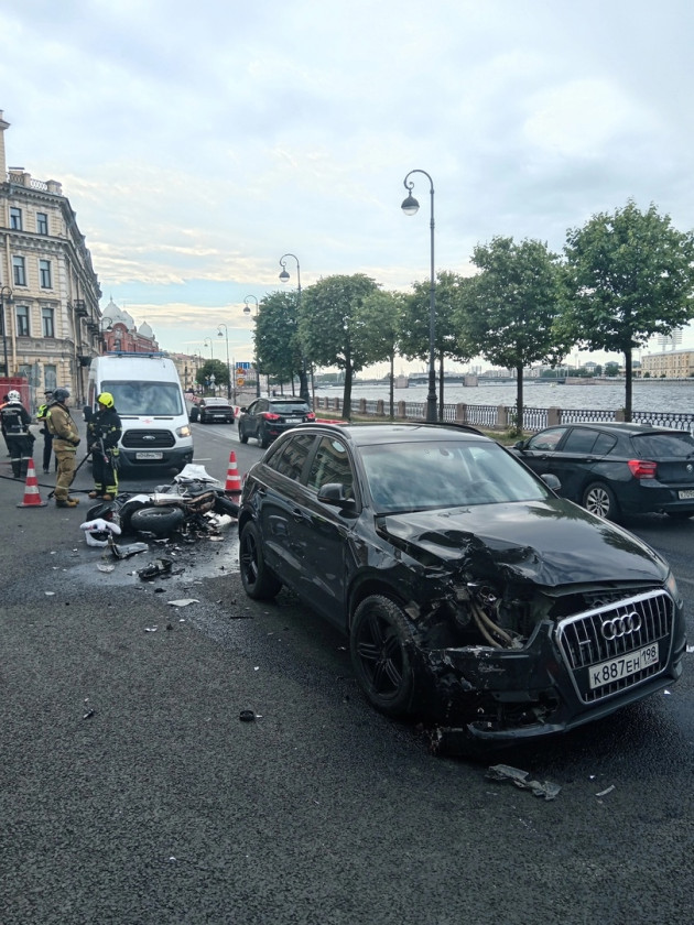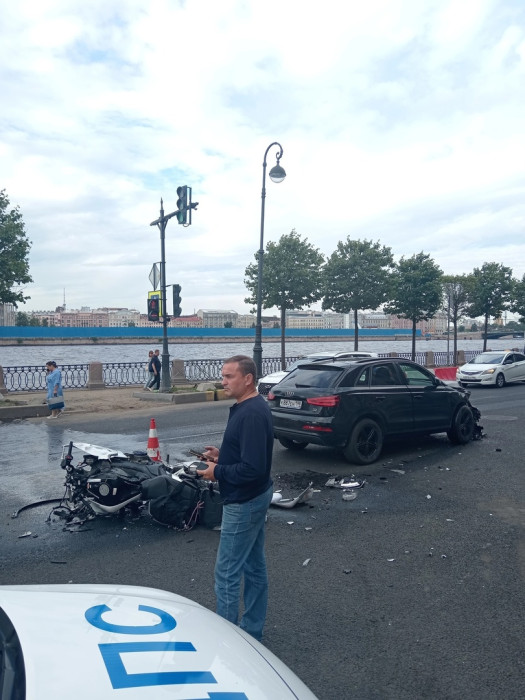 Дтп с мото на перекрестке Биржевой линии и наб.Макарова. Авто и мот. Мотоциклист Евгений, живой, в сознании, увезли в Мариинскую больницу.