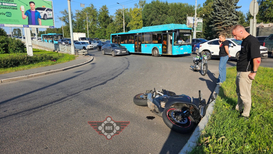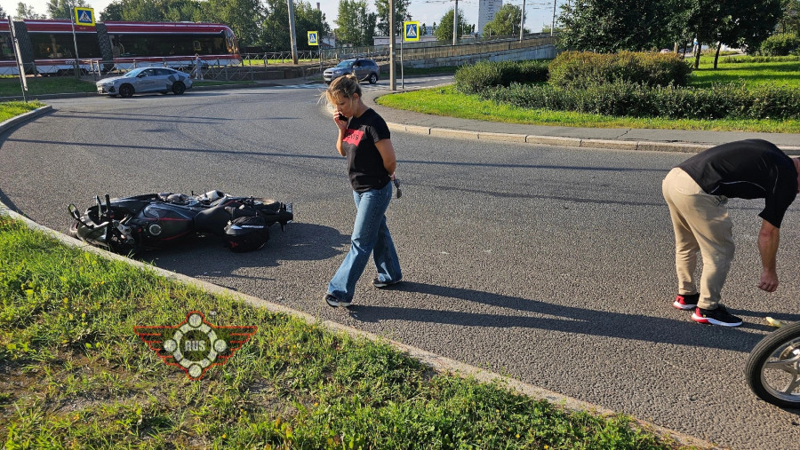 Дтп с мото на пр.Стачек, съезд с моста на ул. Морской Пехоты. Мотоциклист в порядке, ждут ДПС.