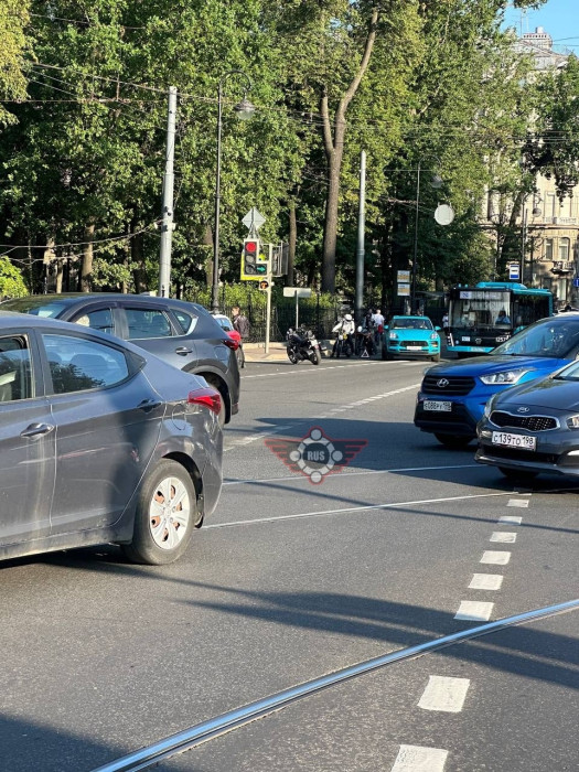 Дтп с мото на перекрестке Каменноостровского пр. и Песочной наб. Авто и мот. Мотоциклист на ногах.