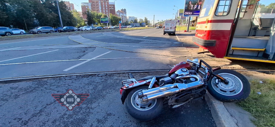 Дтп с мото на пр. Энгельса, д.120 (м. Озерки). Трамвай и мот Harley Davidson. Мотоциклист жив, поехал на мед. осмотр. На месте друг мотоциклиста.