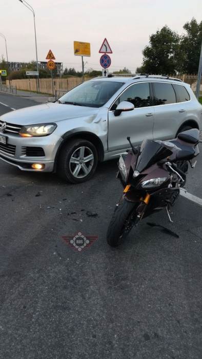 Дтп с мото на Стародеревенской ул., д.3. Авто VW Touareg и мот Yamaha. Мотоциклист в порядке, от помощи отказался.
