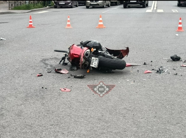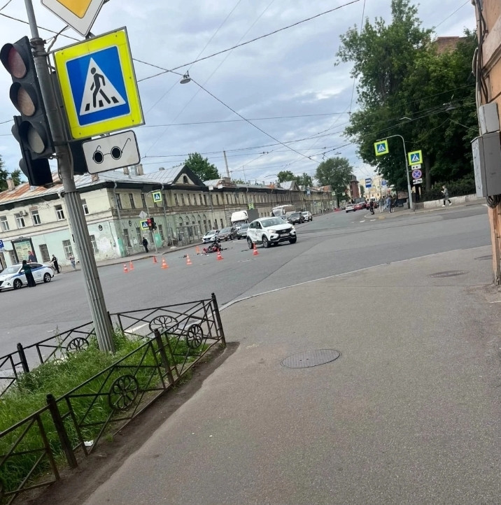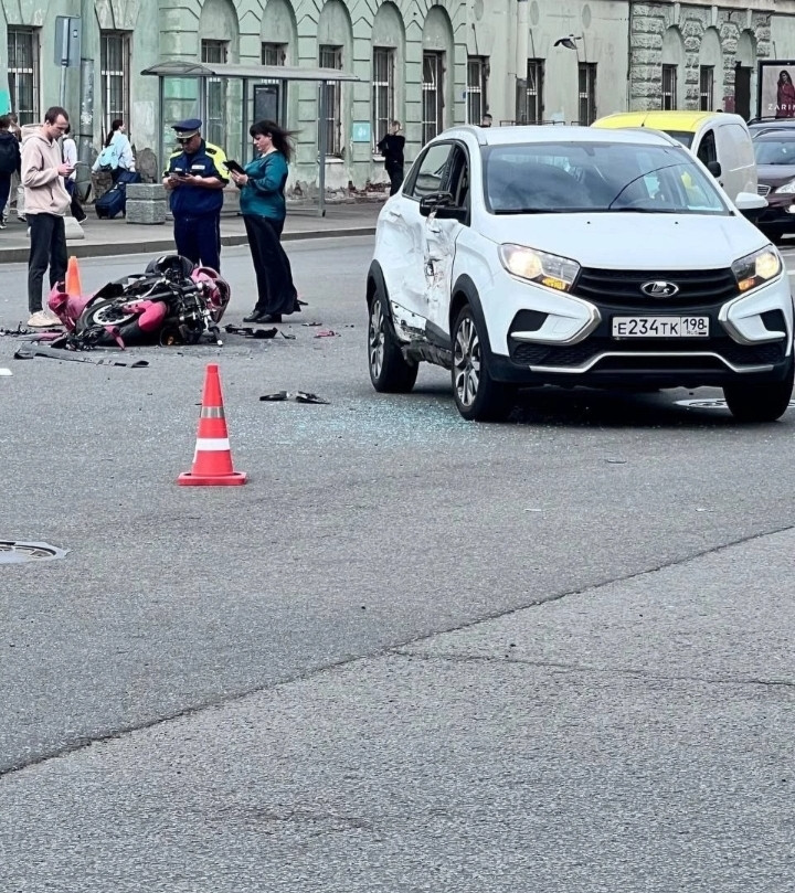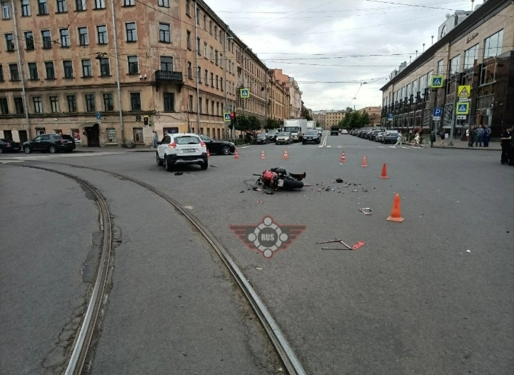 Дтп с мото на перекрестке Звенигородской ул. и ул.Марата. Авто и мот Yamaha YZF-R1 номер 0406АТ78. ДПС на месте. Мотоциклист (в сознании, открытый перелом бедра) увезен в больницу. Родственники на месте. Мотоцикл заберут.