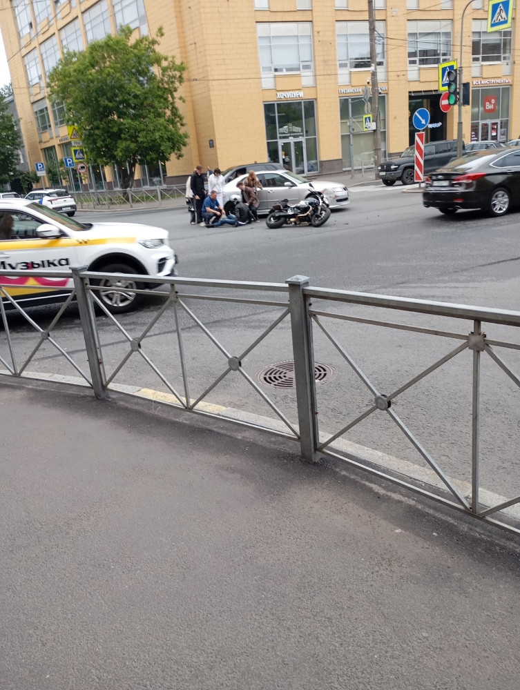 Дтп с мото на перекрестке пр.Медиков и ул.Профессора Попова. Авто и мот BMW R Nine T Pure номер 9266АН78. Мотоциклист жив, но пострадал.