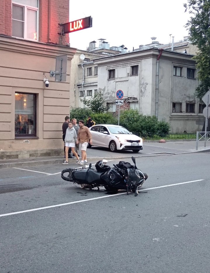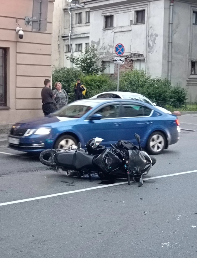 Дтп с мото на перекрестке Чкаловского пр. и Малой Разночинной ул.. Авто и мот. Мотоциклист не пострадал, ходит рядом.