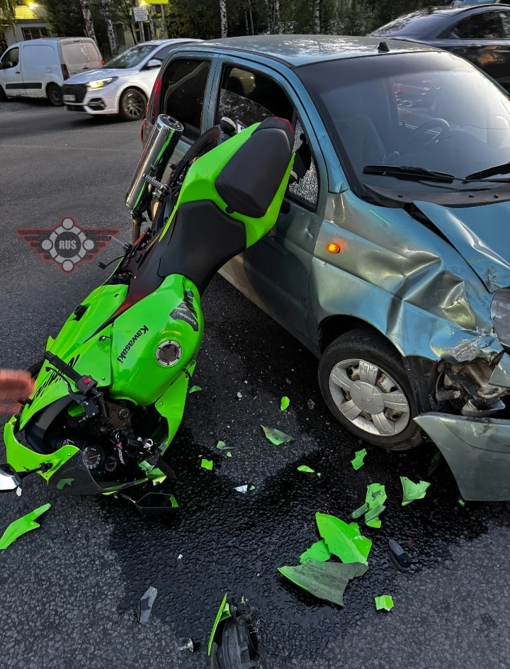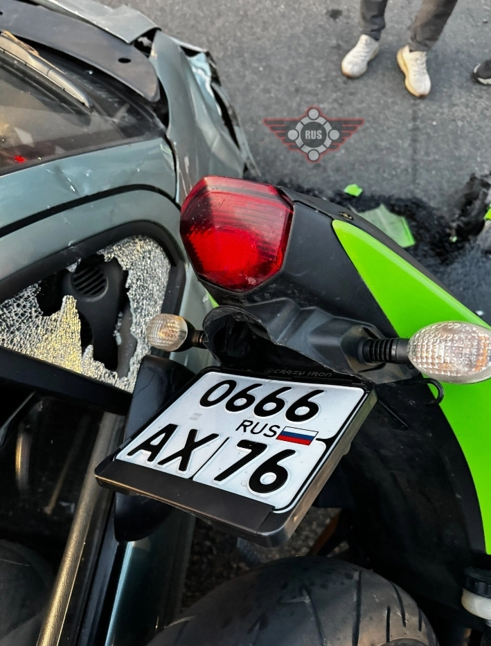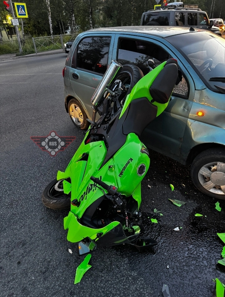 Дтп с мото на перекрестке Восточно-Выборгского ш. и ул. Ларина, Сертолово. Авто и мот Kawasaki Ninja EX250K номер 0666АХ76. Мотоциклист (м.) (кровь в паху) и пассажир (ж.) (что-то с позвоночником) перелетели через машину. В сознании увезли в больницу.