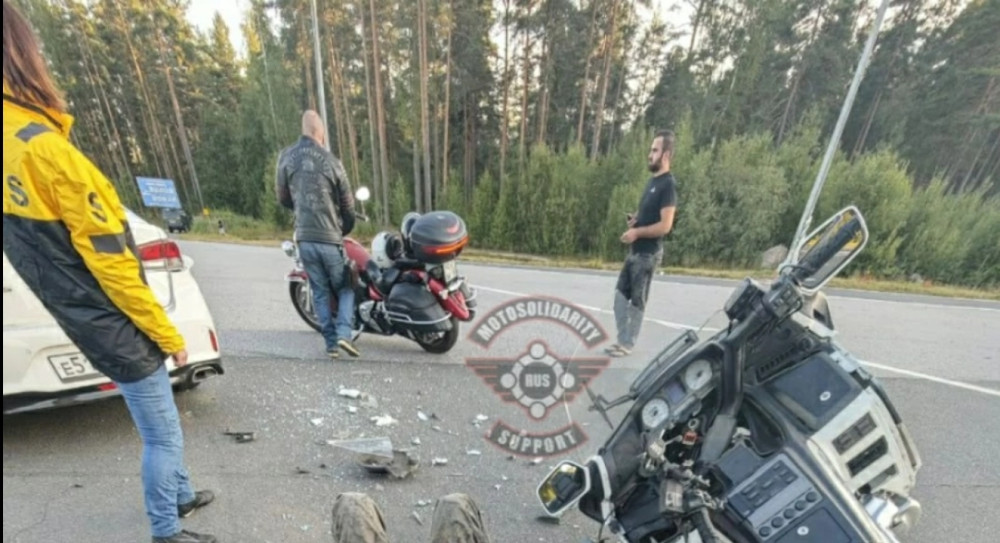 Дтп с мото на А-121 Сортавала, 75-й километр, посёлок при железнодорожной станции Лосево, Приозерский район, Лен. обл.(60.684032, 29.982521). Авто и мот Honda Gold Wing номер 7985АС78. Мотоциклист Ясинский Олег Зигмундович (в сознании, лежит) ждет скорую.