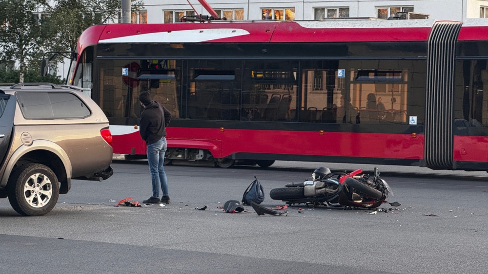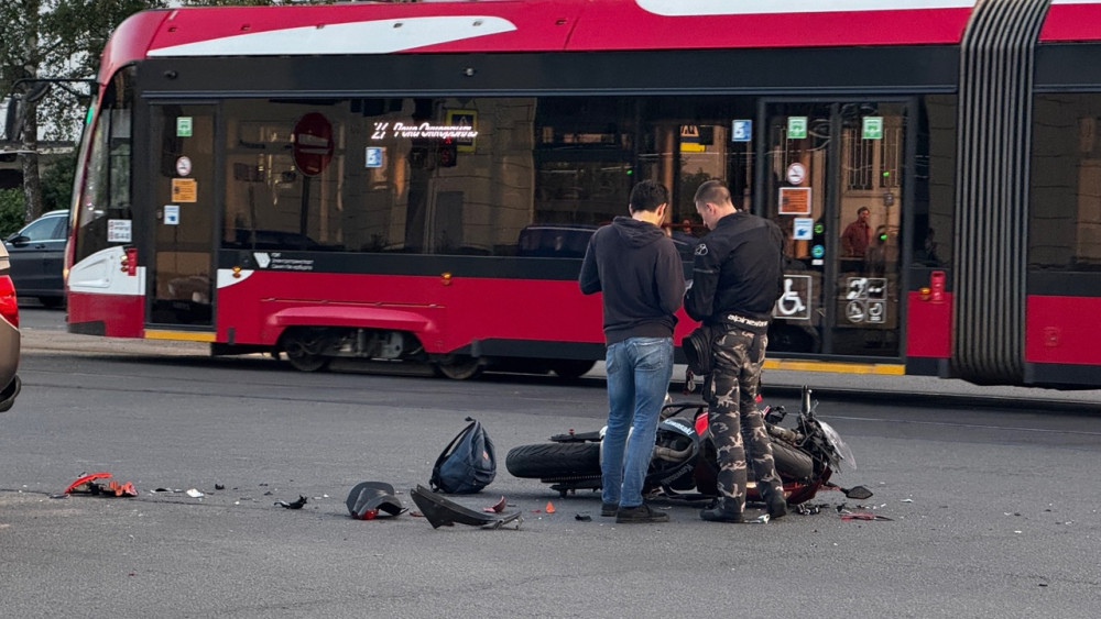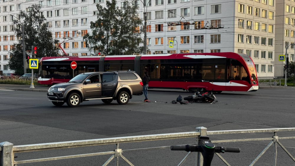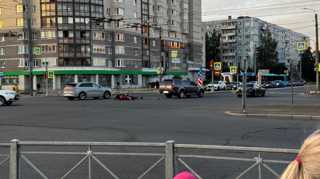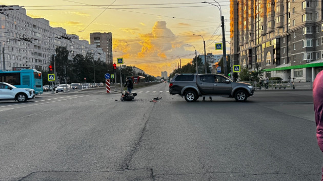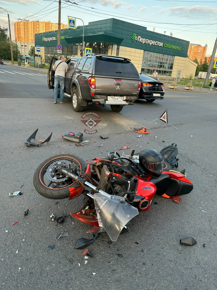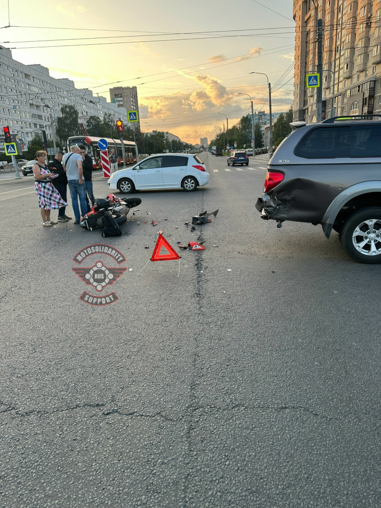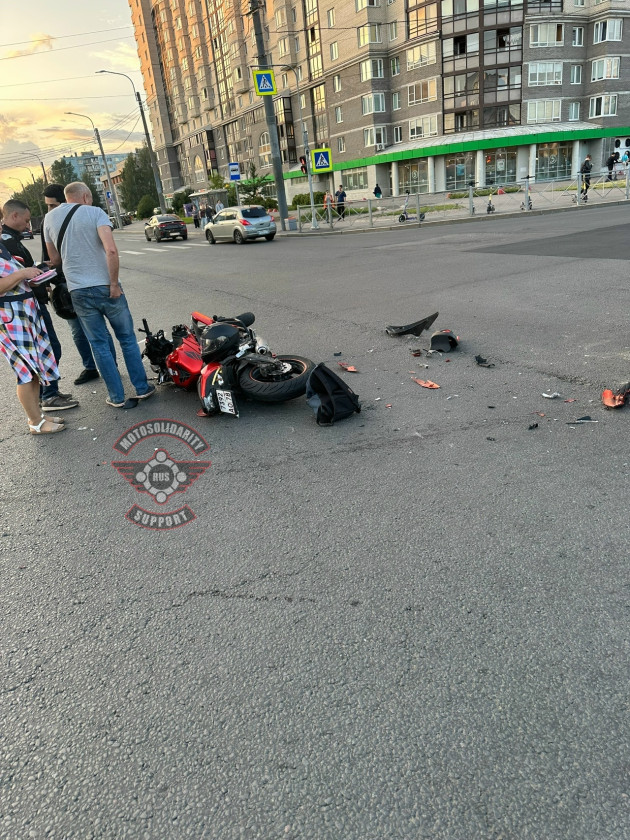 Дтп с мото примерно в 20:20 на перекрестке пр.Солидарности и ул.Подвойского. Авто и мот Kawasaki Ninja 650 номер 7392АО78. Мотоциклист в сознании, на ногах, жалуется на кисть. Ждут службы.