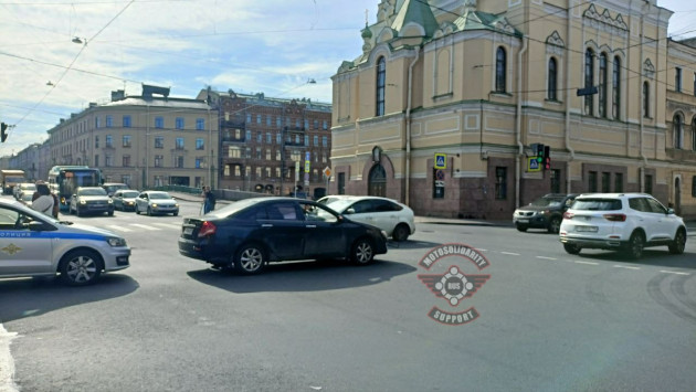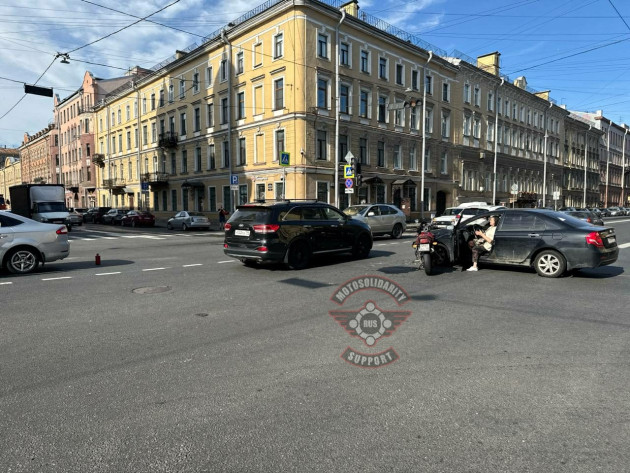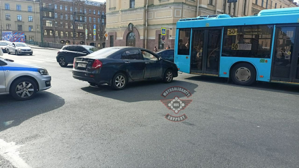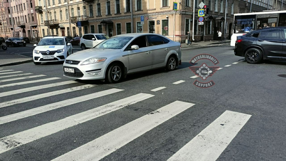 Со слов очевидцев, мотоциклист двигался по Римского-Корсакова в сторону центра. Судя по всему на зелёный. Форд поворачивал с Римского-Корсакова налево в сторону Фонтанки. Мот задел задний бампер Форда и отлетел в Лифан, который стоял тоже на левый поворот.