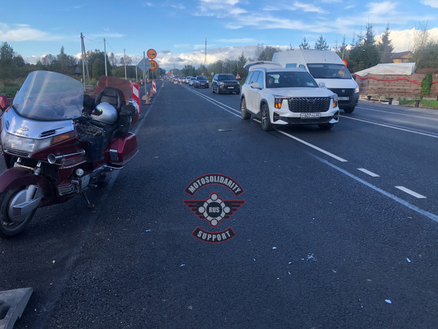 Дтп с мото 19.09.2025 в 16:45 на 86-м км. Киевского ш. (Р-23) (59.245242, 29.931003). Авто и мот. Мотоциклист в порядке, ушибы.