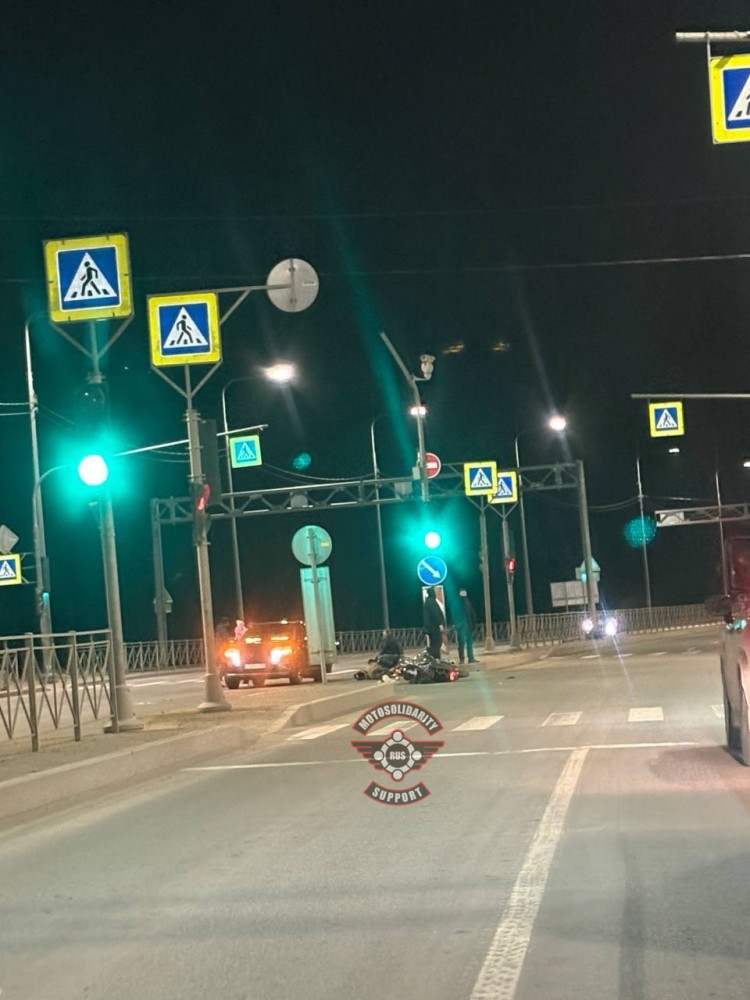Дтп с мото примерно в 21:00 на перекрестке Рубежного ш. и Понтонного проезда, Колпино. Авто и мот Honda. У мотоциклиста Романа травма ноги.
