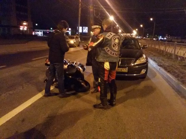 Легкая авария. Мерс не успел оттормозиться и долбанул мотик. Скорости близки к нулю были. Пилот Женя Шум. Всё ок. Помощь не нужна.