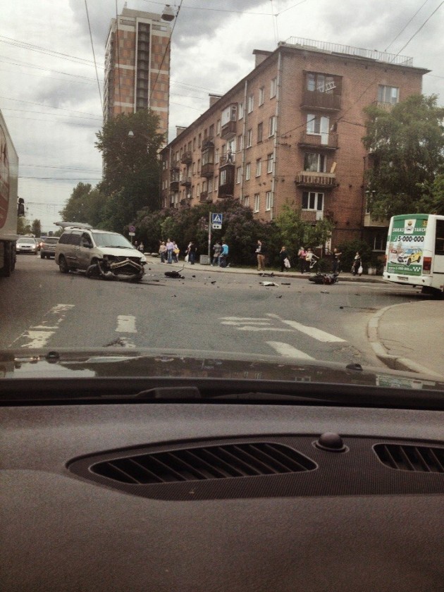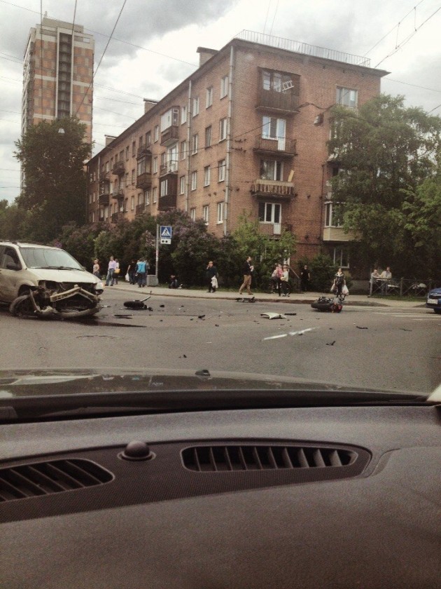 Угол Седова и Елизарова. Жесткое дтп, лежит мотоцикл без переднего колеса (валяется рядом) и машина, у нее разбит весь перед. Приехала полиция (с)
