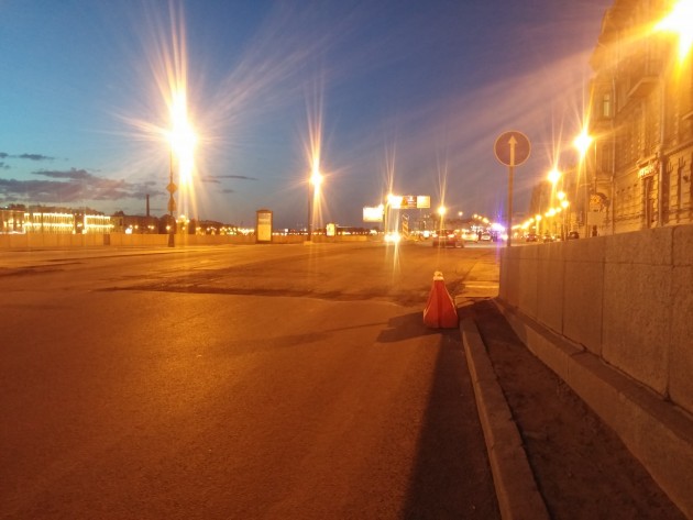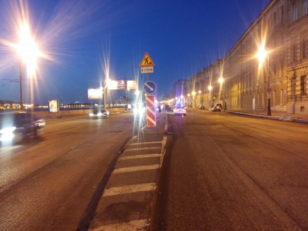 Асфальт срезан сразу на выезде из тоннеля под литейным мостом. Знаков нет никаких. Точнее есть, но уже через 50 метров после среза. Причем срезан асфальт очень высоко и неровно. Насыпан гравий.