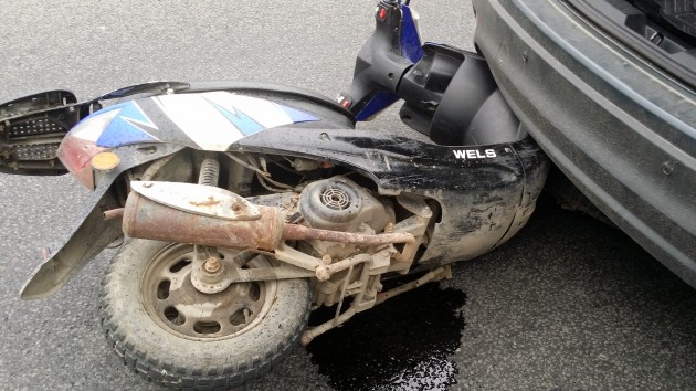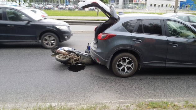 Скутерист на скутере 50 куб. см. не справился с управлением, упал и залетел под впереди идущую машину. У скутериста ушиб левого плеча, от травмы головы спас шлем. От медицинской помощи он отказался. Эвакуатор не требуется. ДПС вызвали. Дополнительная помощь не требуется. Публикую, чтобы проинформировать о пробке и напомнить об этом проклятом повороте (уже четвертая авария с начала сезона с участием мото).