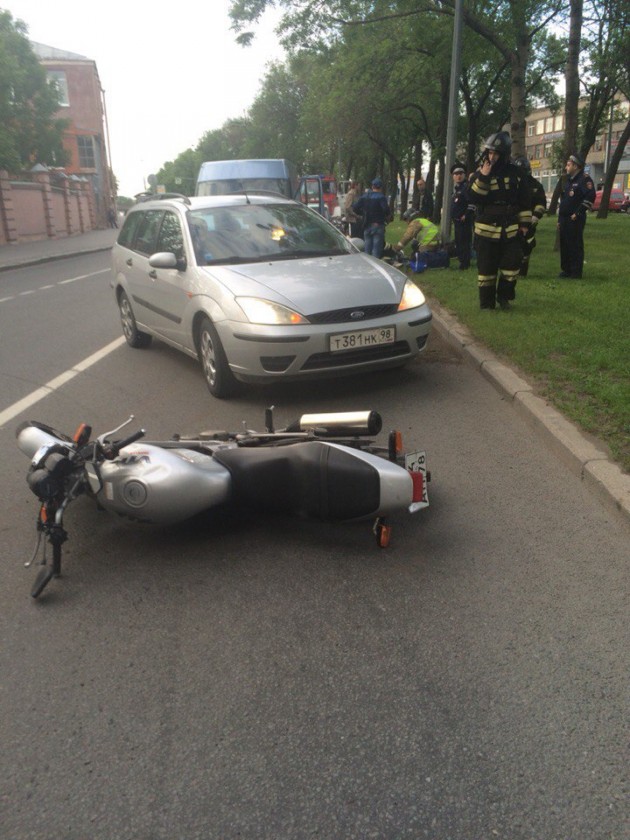 Сбит мотоциклист. Предположительный виновник скрылся. Лиговский 281. Мотоциклист в плохом состоянии. Ждут скорую. Полиция и пожарные на месте