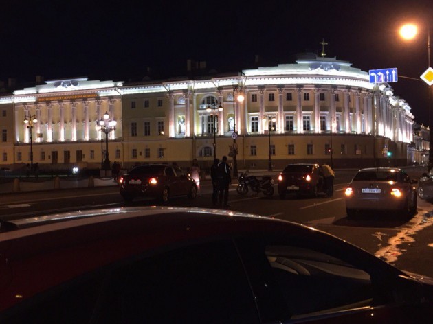 Из ВК : "на Адмиралтейской набережной,девушка на церато подрезала мотоциклиста,тот завалился на бок,а мотоцикл покатился в стоящий на светофоре Логан. Все живы,ждут гаи".