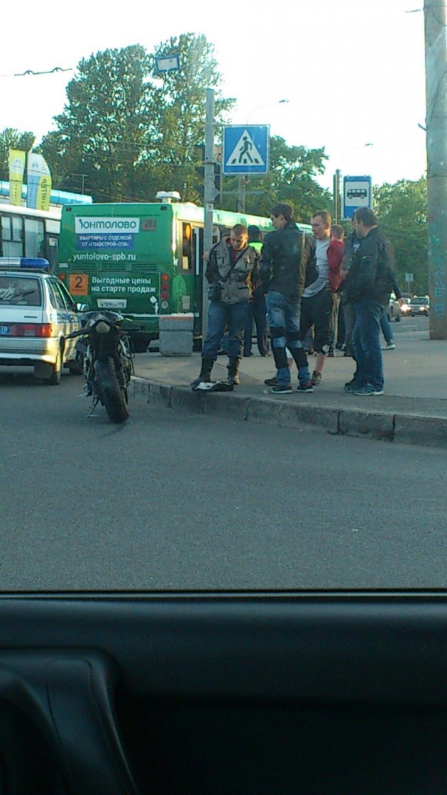 Мотик только что откатили. Похоже что с автобусом встретились.