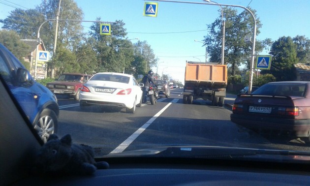 Только что мотоциклист зацепил дастер,500 метров от съезда с кольца в парголово в город,актуально на 18:10.
