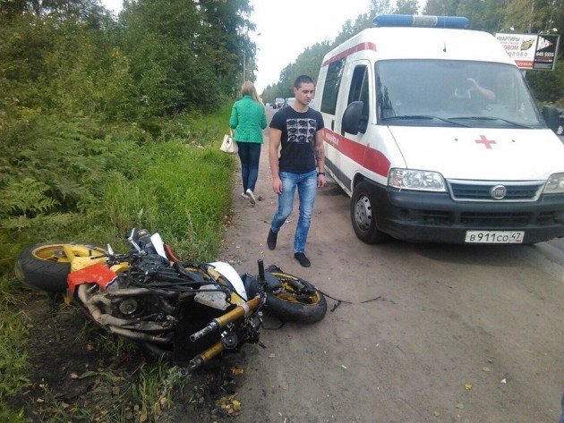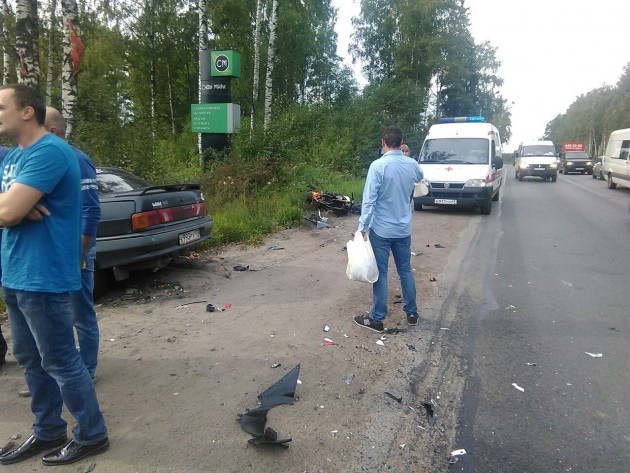 ДТП на Выборгском шоссе. Между заправкой Лукойл и строймаркетом. Мото и авто. Примерно в 15:00. Мотоциклиста увезли на скорой, водитель на месте. Все живы. Скорая приехала почти сразу