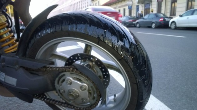 разлилось много масла,мотоциклист жив и даже без царапин!!!но масло уже раскатали!тормозить не возможно, хуже льда.!