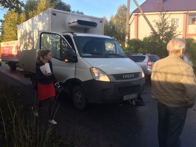 Байк лежит на дороге (на фото - за грузовиком), шлем с дырой на задней стороне лежит под бампером грузовика.