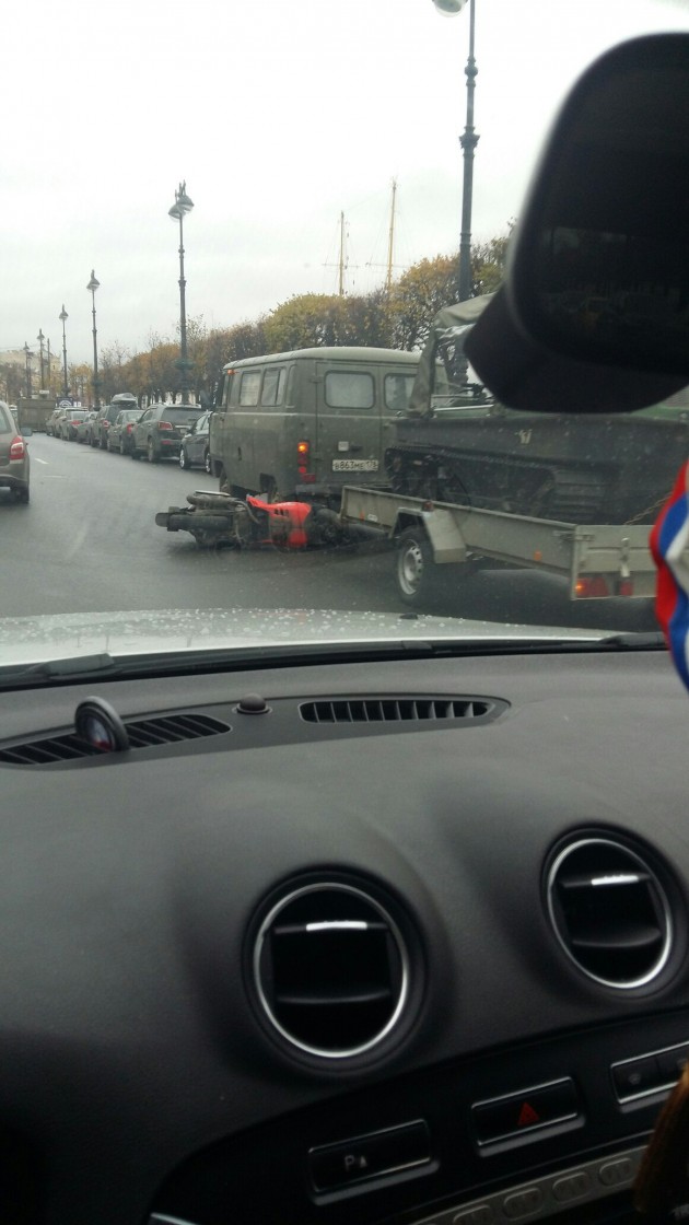 Проезжал там час назад. Буханка с прицепом стоит на перекрестке, явно двигалась по набережной прямо в сторону Благовещенского моста. Мотоцикл лежит поперек дороги между машиной и прицепом слева от сцепки.