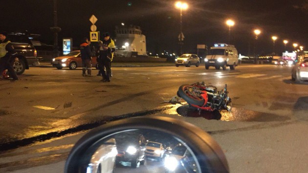 ДТП с мотоциклистом. Васильевский остров, перекрёсток, Набережная Лейтенанта Шмидта и 10 линия. Все службы на месте, движение не перекрыто. Водители живы, мотоцикл вклочья:(