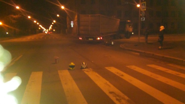 Пересечение Двинской и Виндавской ул. Мото под фурой, на дороге лежит шлем, служб нет. Фото делать не стала, но вроде мотоциклист жив.