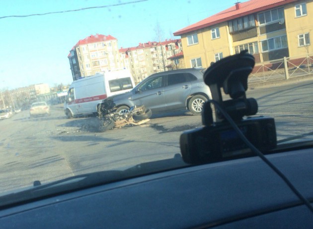 Мотоциклист двигался по Сапёрной улице, в сторону Красносельского шоссе, Mitsubishi ASX выезжал с Госпитального пер. и видимо не заметил мотоциклиста. Итог на фото. Скорая на месте, ДПС нет.