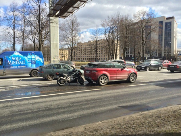 Авария на Пискаревском 2 около БЦ Бенуа. Land Rover Evoque & kawasaki zzr 400. Со слов владелицы авто, после аварии мотоциклист поднял мот и держась за руку ушел в сторону БЦ. Больше его никто не видел. На моте гос.номера нет.