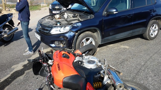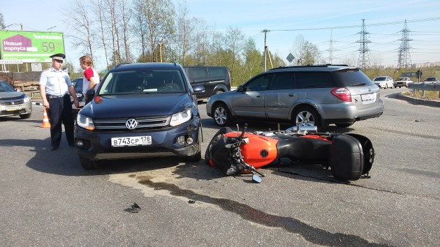 Сегодня около 16-10 по дороге на мероприятие в Охта Парк, посвященное открытию мотосезона, путь нам преградил Тигуан. Мот двигался в прямом направлении со скоростью около 45 км/ч, автомобиль выскочил из-за стоящих на перекрестке машин, пытаясь повернуть налево по главной дороге. Замечен был поздно,тормозного пути не хватило. Вину пилот не отрицает, знак был не замечен из-за движущейся правее газели. Все живы, почти здоровы, у пилота ушиб обоих рук, второй номер, т.е. я не пострадала)