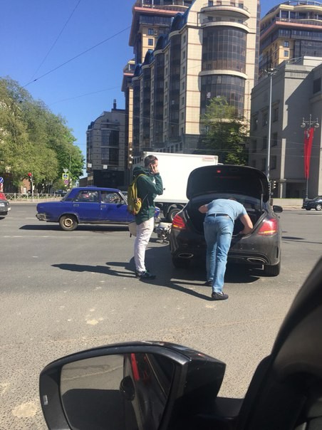 Мерседес с Мото. На Московском и Киевской, Мото и перед Мерса разбиты. Все живы, ставят знак, звонят куда-то. Служб нет.