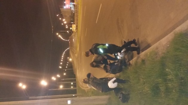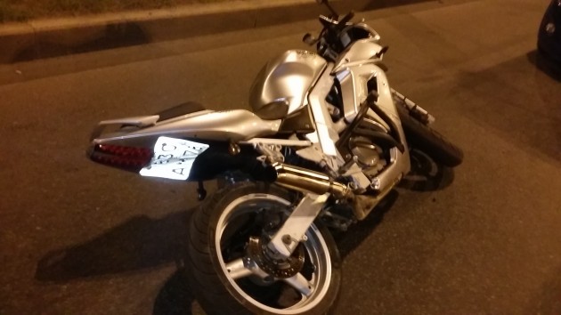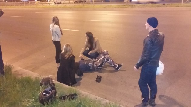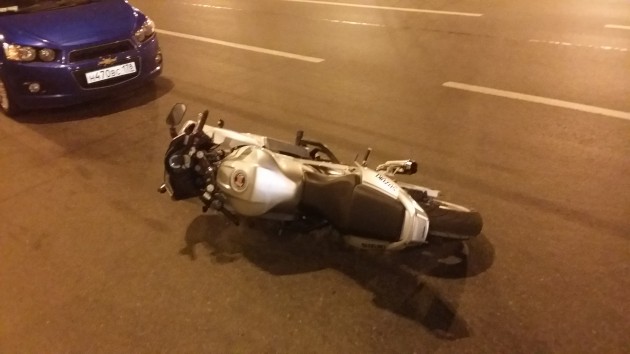 При сьезде с виадука упал пилот. По словам машина перед ним резко оттормозилась, не справился упал. Жив. Увезли в травму по соседству, мот на ходу в итоге доставили в гараж.