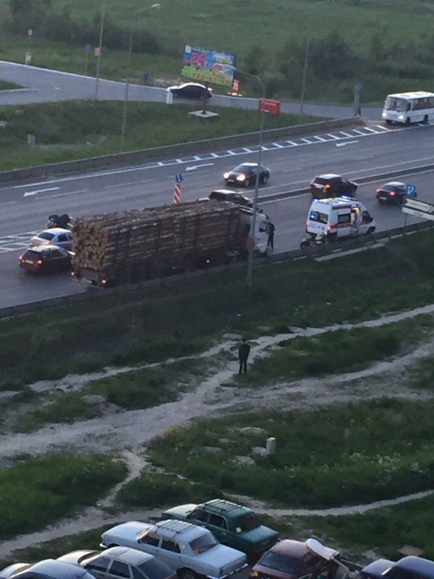 Красносельское шоссе, 56, скапливаешься пробка, правы ряд фура с брёвнами подбила мотоциклиста, живой, но лежит.