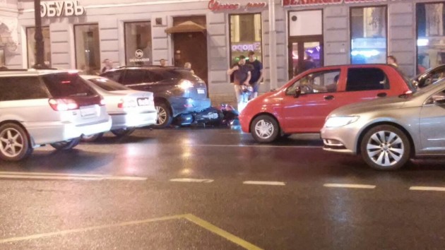 Около сбербанка на Невском проспекте в сторону ТРК "Галерея". Мотоциклист залетел под автомобиль, мотоциклист жив.