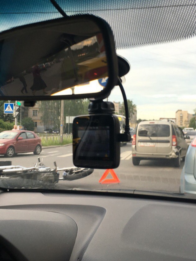 ДТП с мотоциклом на перекрестке Ударников и Наставников. Вроде бы все целы, ждут службы.