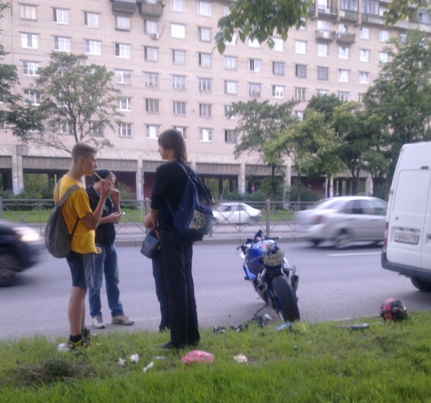 "Час назад наблюдал падение мотоциклиста на Бухарестской 72.Летел он плашмя метров 100..перед весь в крошку..но парень встал сам.был бодр.И конь стальной и наездник"