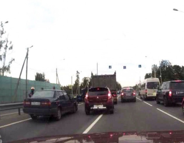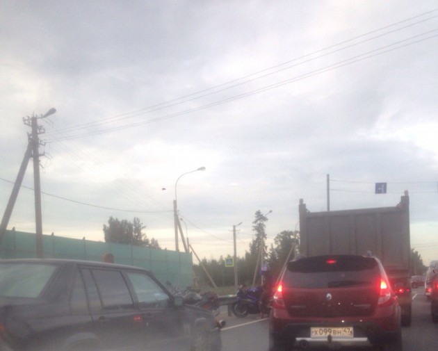 На Дороге Жизни мотоциклисты окружили машину. Вроде никто не сбит. Водителя машины тоже не видно. Может авто задел мото.