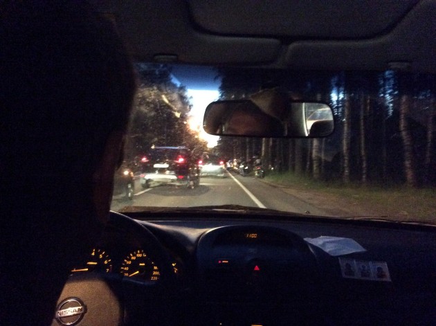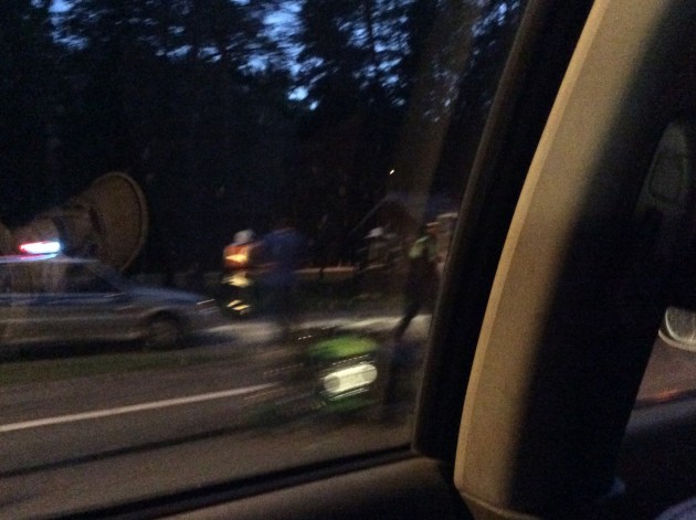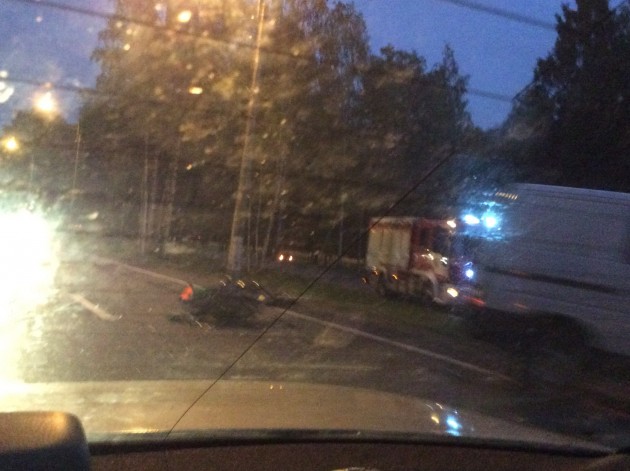 На Приморском шоссе около Ольгино в сторону Сестрорецка. Мотоцикл на дороге лежит, три авто рядом. У мотика зад смят. Мотоциклист живой в сознании. Служб нет, собирается пробка.