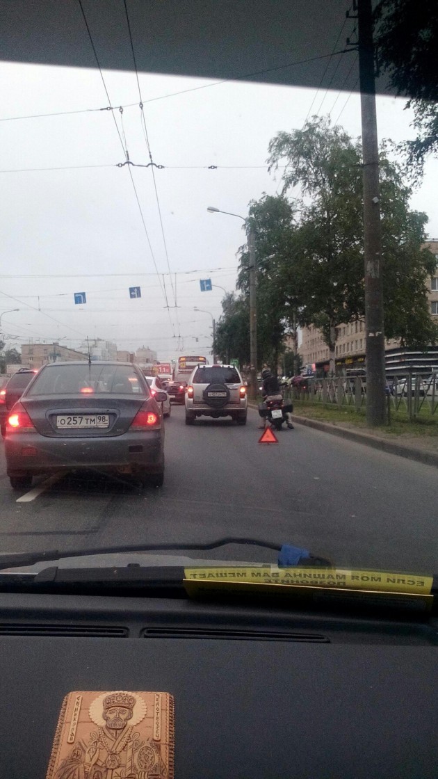 Ехал вдоль бордюра, джип начал перестраиваться не увидев меня (или не смотря в зеркала), защемил меня, я вылетел, вот вся песенка.