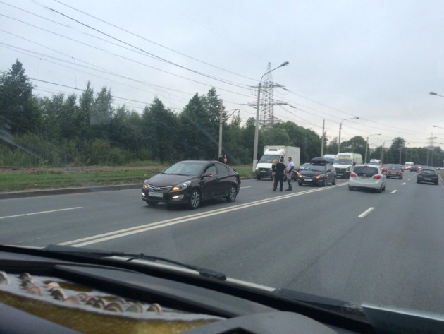 Петергофское шоссе, после поворота на п. Ленина не доезжая переезда через трамвай паровозик из 2-х легковушек и тешки, левая полоса, пробка от ЛЭМЗа.