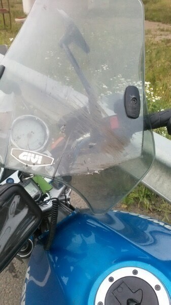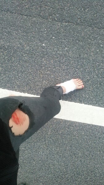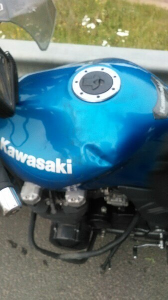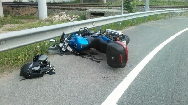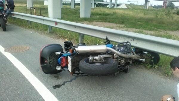 Это я двойкой ехала и друг пилот. Ехали с Кронштадта на съезд. Был крутой поворот решили залажить, рамой зацепились и нас занесло. Пилот с мотоциклом в отбойник, я улетела. У мотоцикла вилка перевернулась, рама с подножками порацапаны и бак помят. Так же маленькие трещинки и где-то слетела краска. Меня зажало мотоциклом и я очень сильно повредила ногу и руку. Пилот же обошелся пару царапинами.