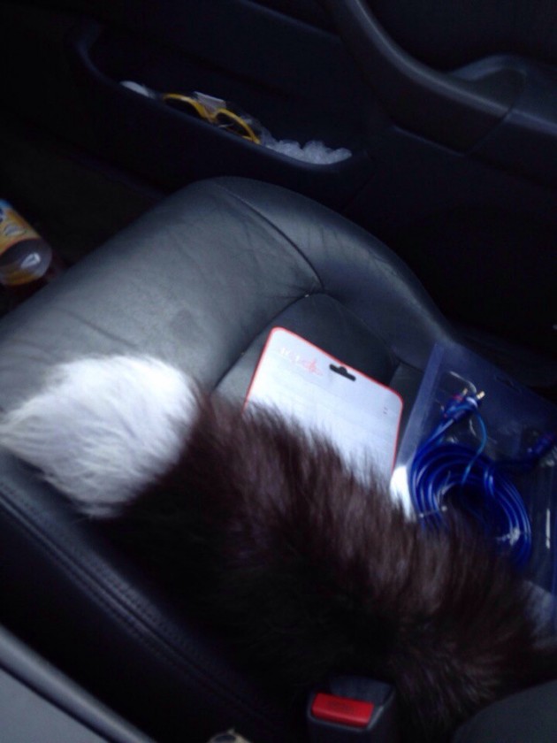 ехал от Песочного в сторону Выборгского за байкером. На кофре было два меховых хвоста, один оторвался и упал на дорогу. Остановился, подобрал, готов вернуть хозяину, если тот скинет фотку второго хвоста на кофре)
